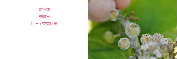 白粉病:一种白色真菌,很多绿植包括葡萄藤绿叶和刚挂上的葡萄幼果都容易感染。果实若被染,结局是开裂、腐烂。